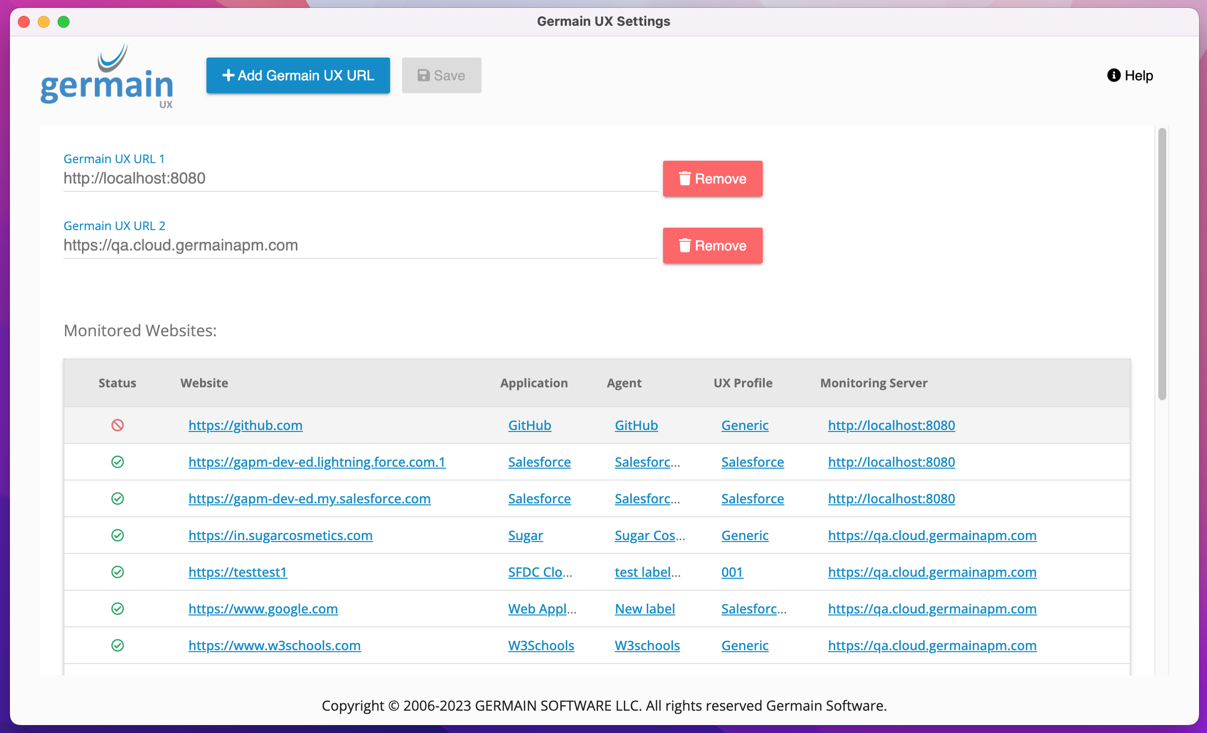 Multiple Germain URL Support: Many clients operate both QA and PROD instances of the monitored application as well as the monitoring application (Germain UX). This enhancement enables Monitored Users to install a single Germain RUM Extension in their browser, which can seamlessly transmit UX data to either the QA or Prod environments.
