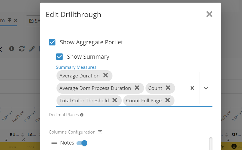 This enhancement enables the capability to add or remove measures within the Summary portlet of any Drill-Through dashboard. For instance, measures like Count, Duration, Total Duration, Percentile 99 Duration, and more can be flexibly managed.