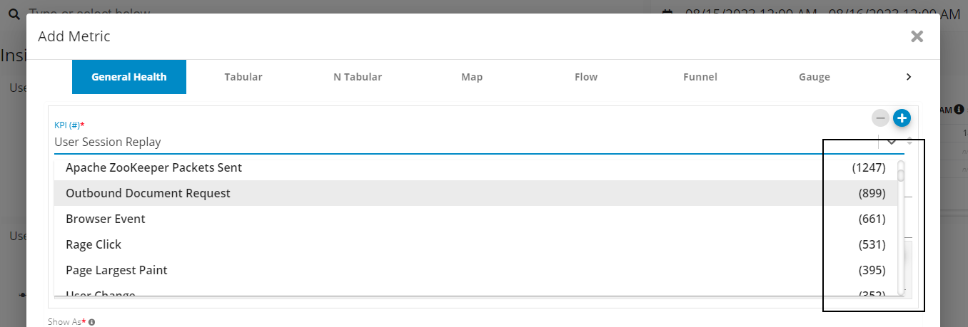 The Data Point Count feature is now available for any key performance indicator (KPI) listed within the 'Add Metric' and 'Explore Your Data' input fields. This enhancement further enriches your data analysis experience.