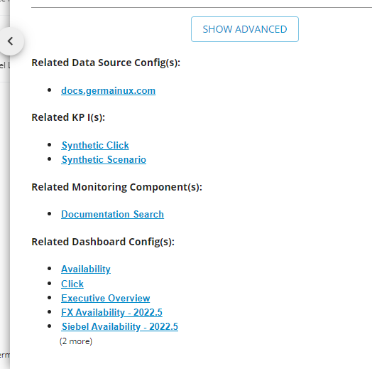This enhancement helps understand the relationship between configuration objects (Kpi, Sla, Alert, Synthetic Transaction, etc). You can now find links on any of the Configuration Dashboards (in Analytics, Automation, Systems folders).