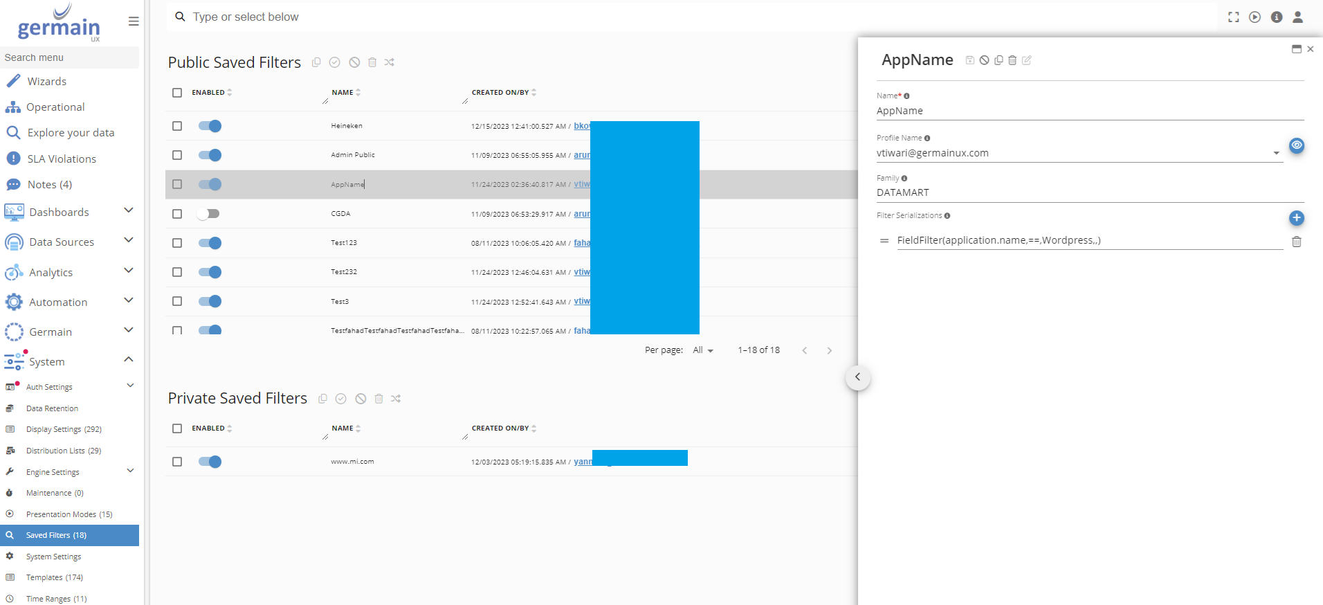 The Filter Management screen empowers your Germain Administrator to maintain filters for various teams. It allows the management of both public and private filters, facilitating updates, disabling, and toggling of filters from a centralized location.