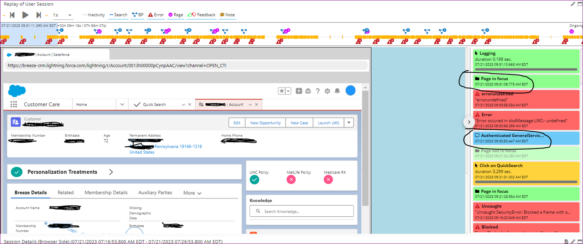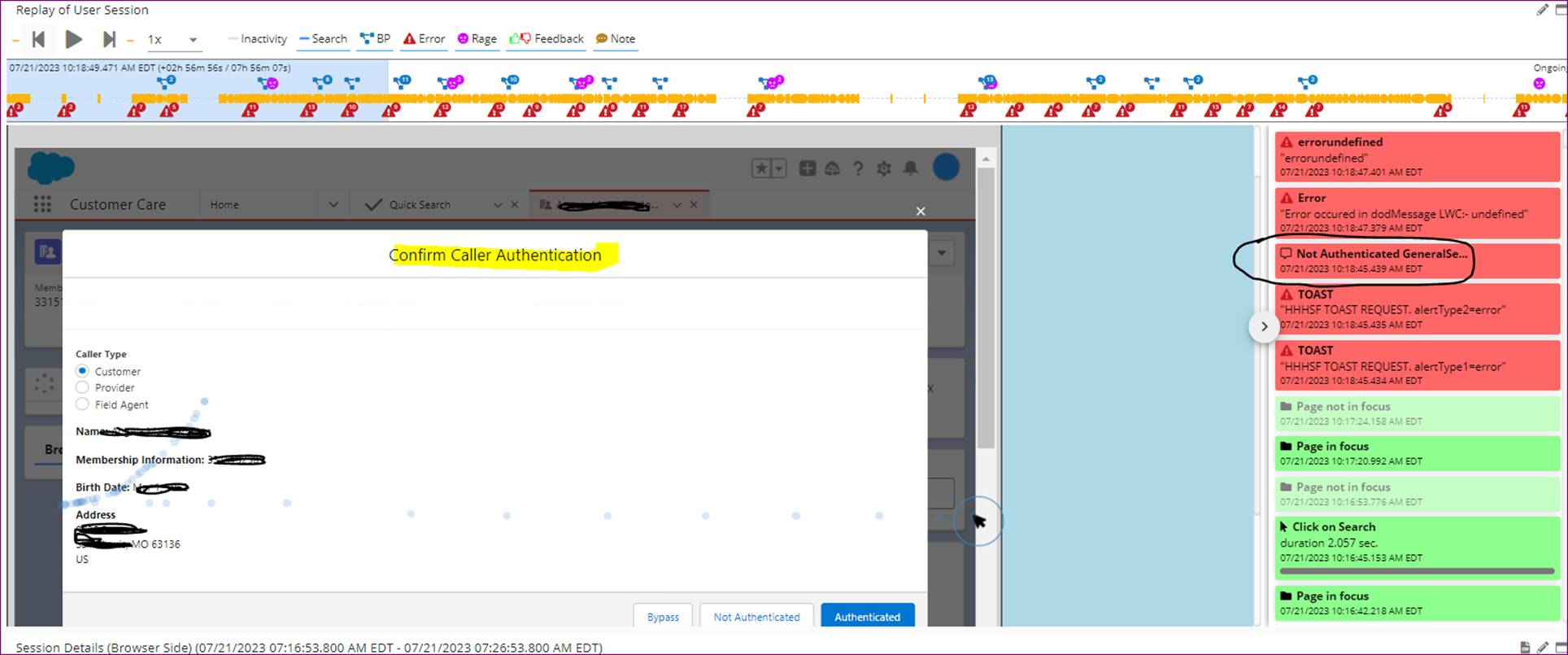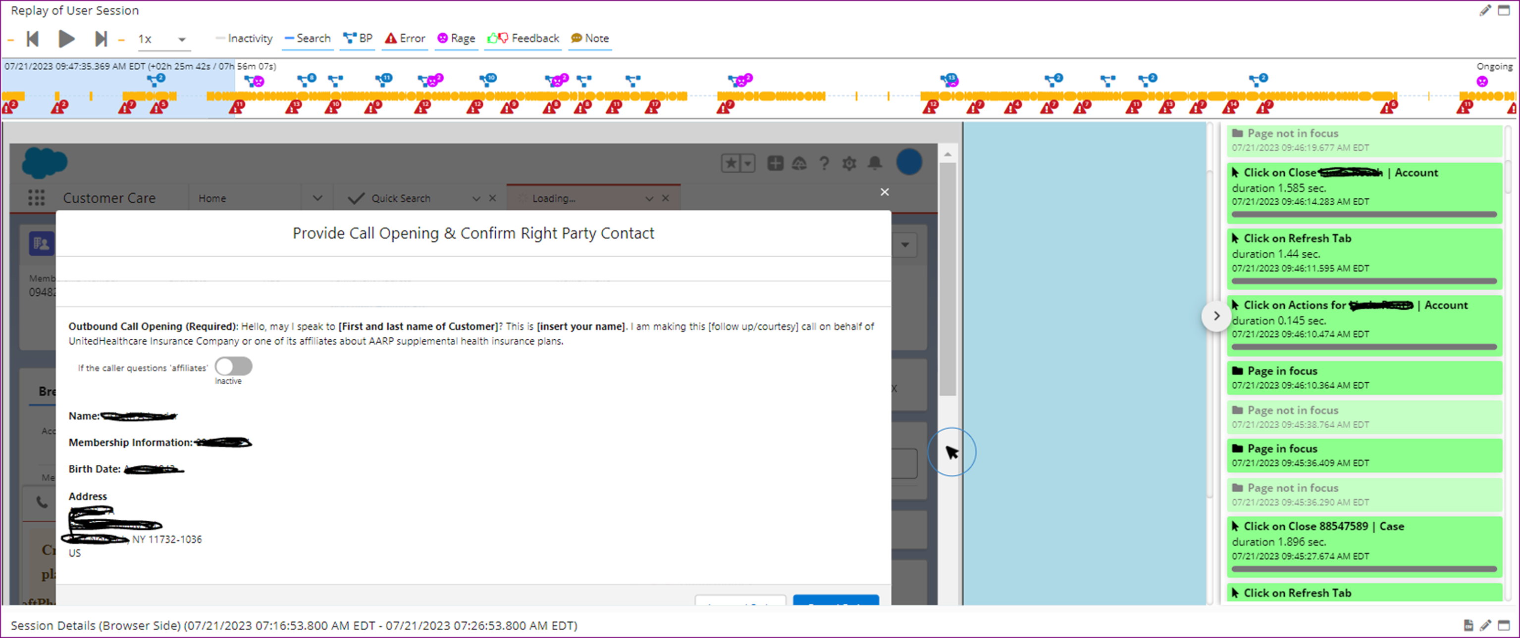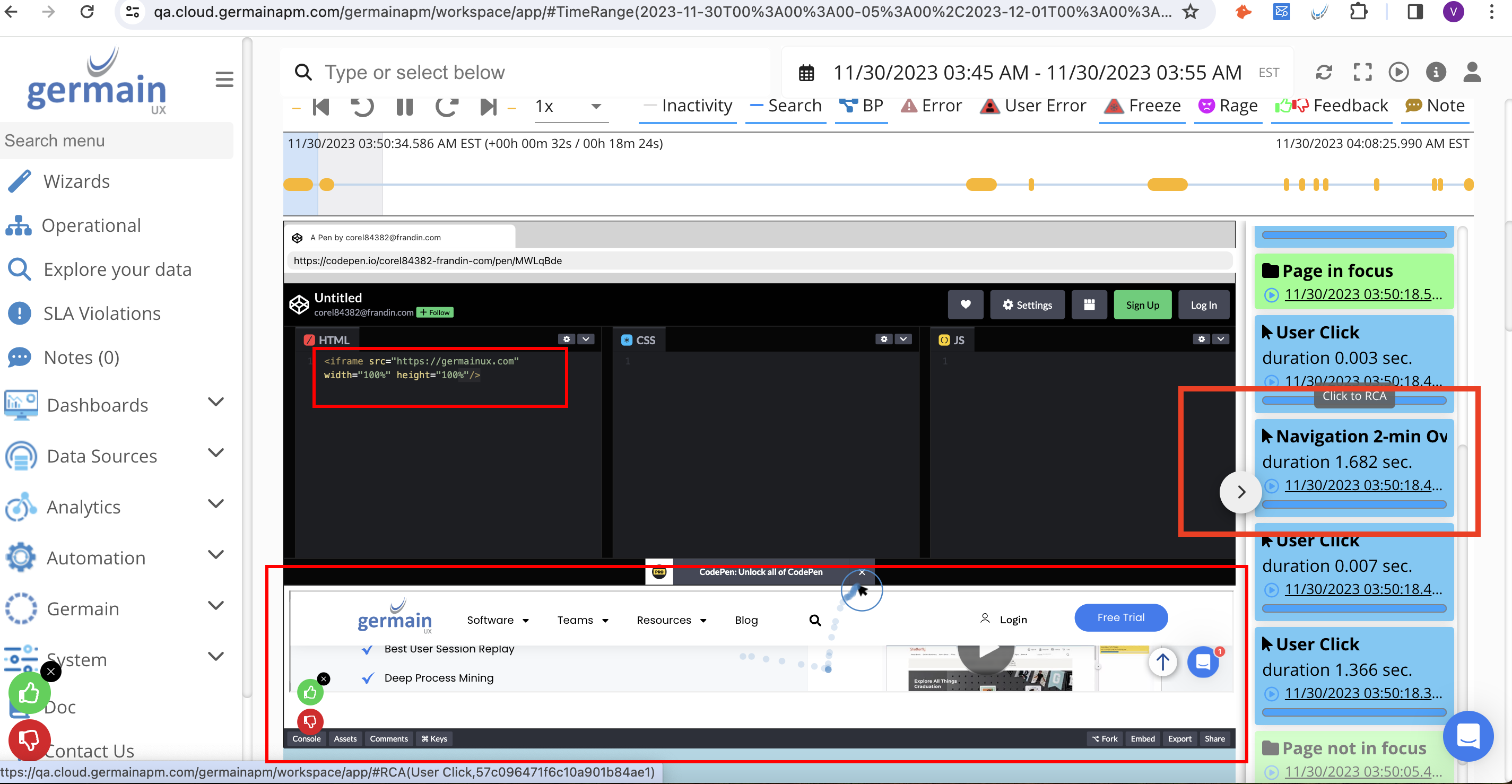 Browser Freeze detected and displayed on Germain UX Session Replay