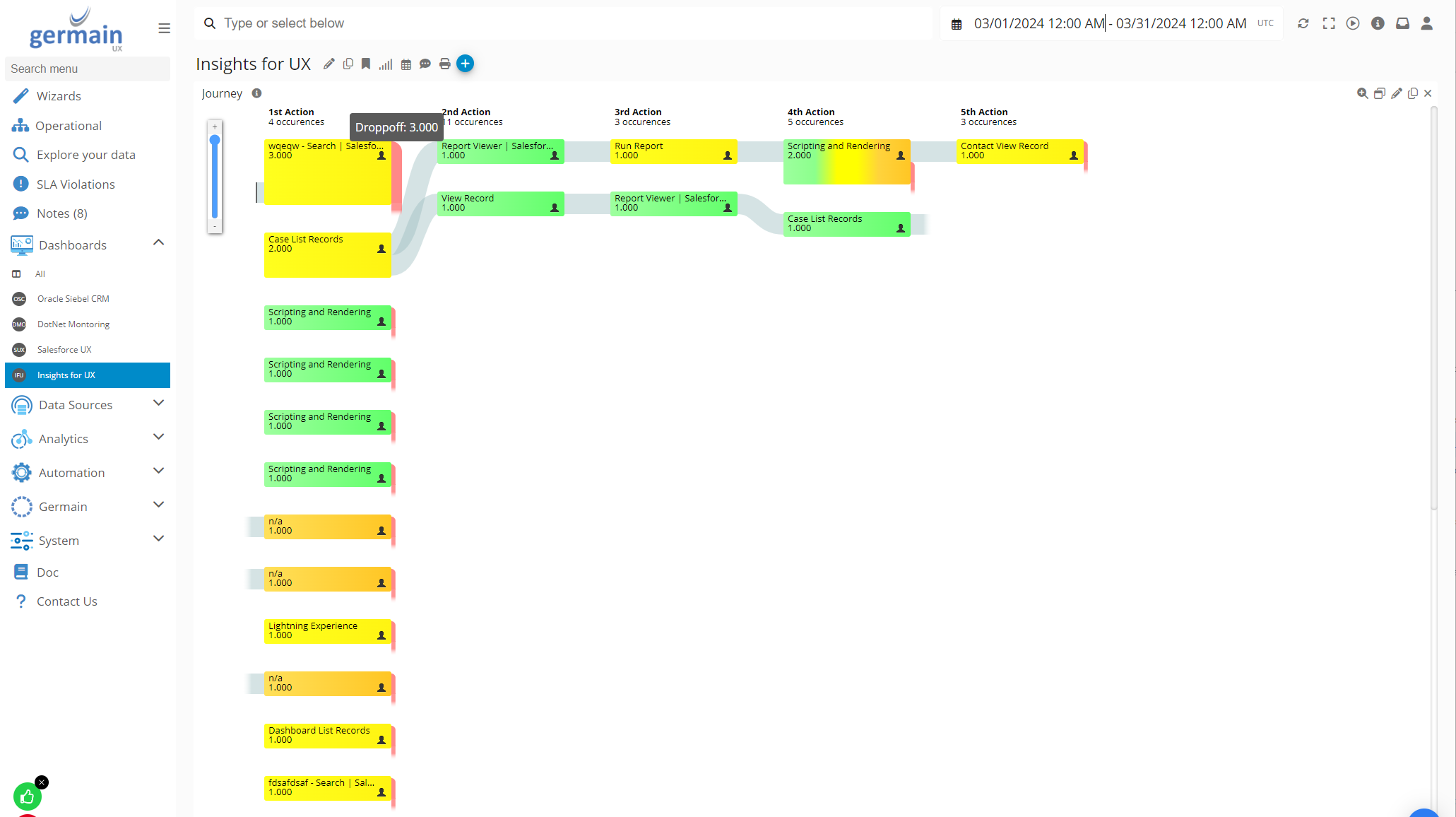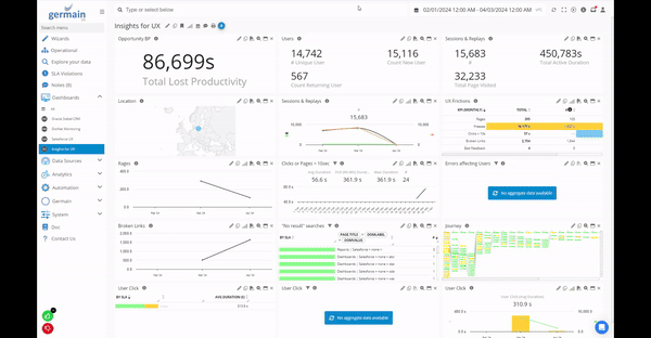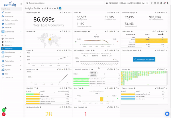 GermainUX now includes an automatic highlighting feature for "No Search Results" instances within various applications like Salesforce, Shopify, Siebel, etc. This enhancement ensures that when users search for something and do not find it, the system will detect and highlight these instances. Depending on the configuration, it can either alert relevant parties or feed the information to an AI chatbot to provide further guidance to the user, preventing such instances from going unnoticed and improving overall user experience.