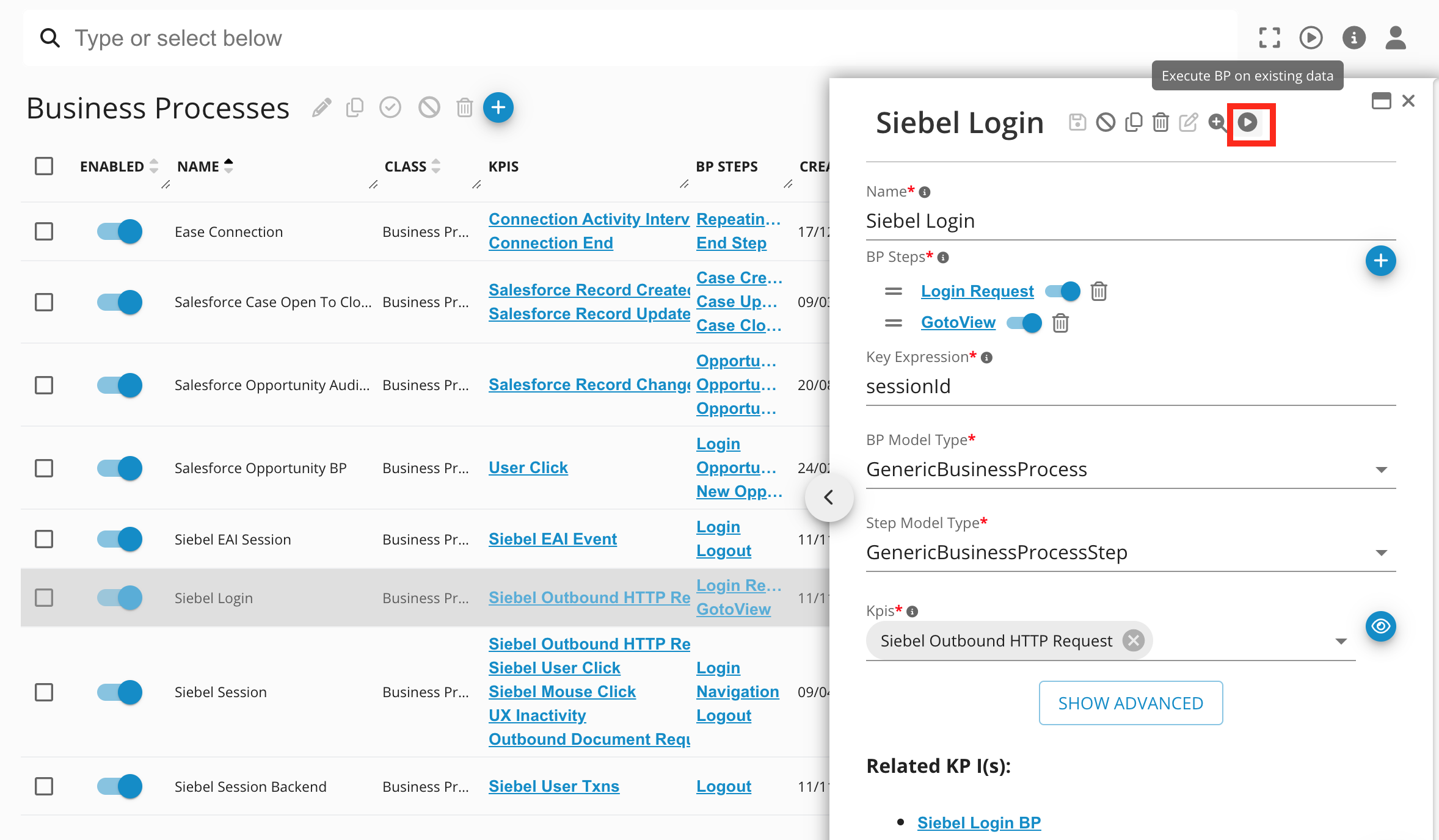 Introduce a 'Execute BP on existing data' button to validate Business Processes efficiently. This feature will significantly reduce the time needed to monitor new BPs in production.