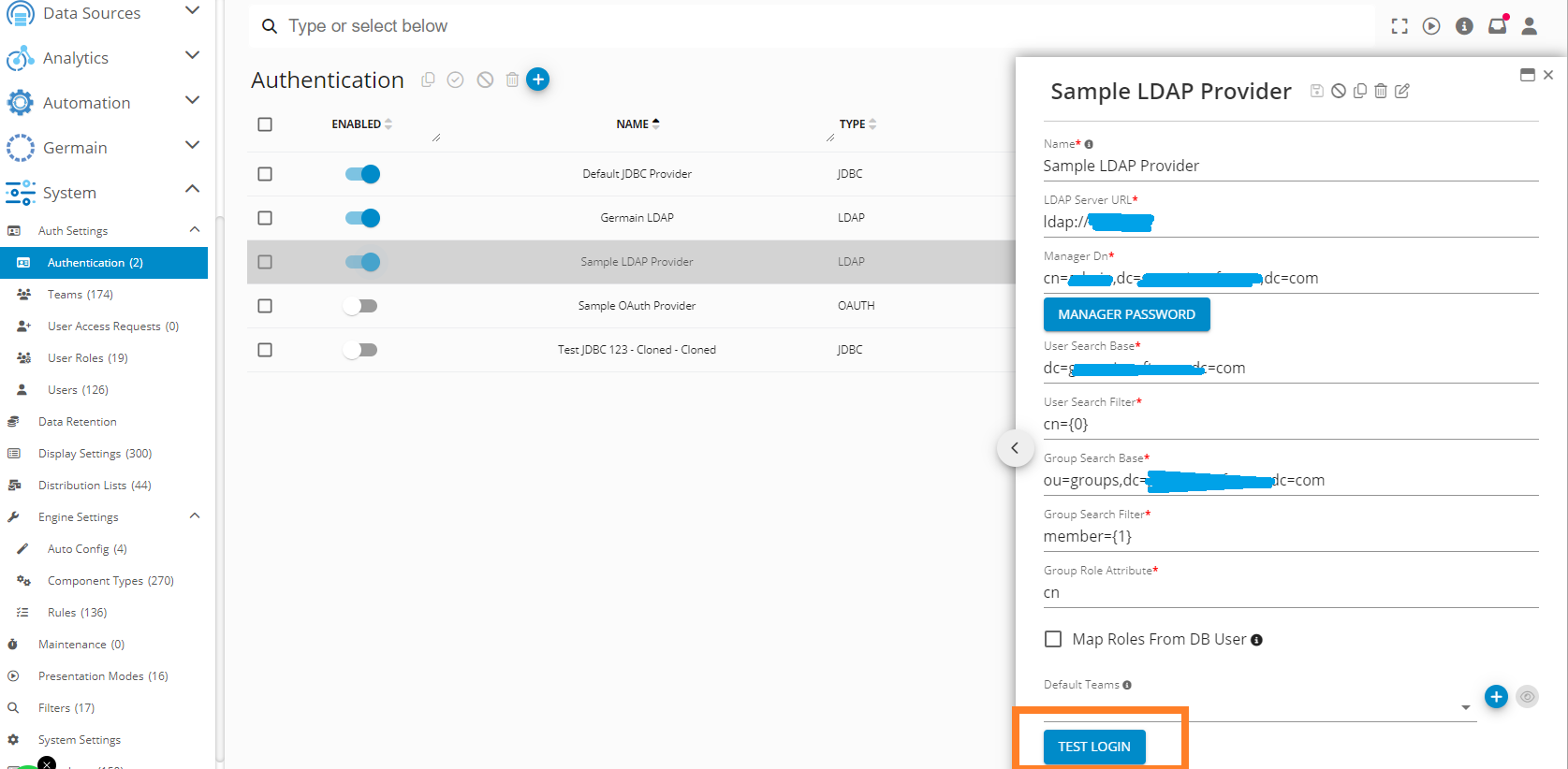 With the latest update, a Test Login button has been added to the LDAP provider screen in Germain UX. This button allows users to verify the provided LDAP settings directly from the interface. The backend now performs a simple query to list users, eliminating the need to restart Tomcat multiple times in case of any issues.