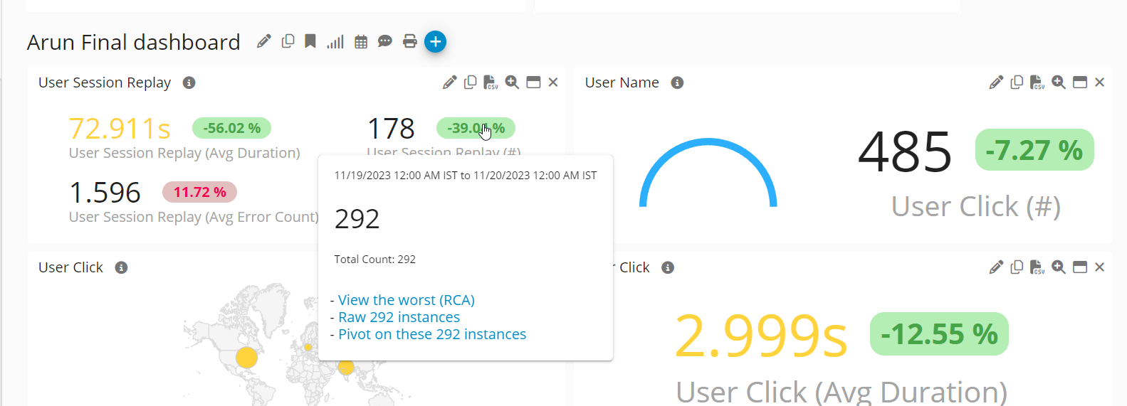 A single click from Aggregate, Drill-through or Pivot Dashboard. The type of RCA dashboard varies and depends on the type of metric you drilldown onto.