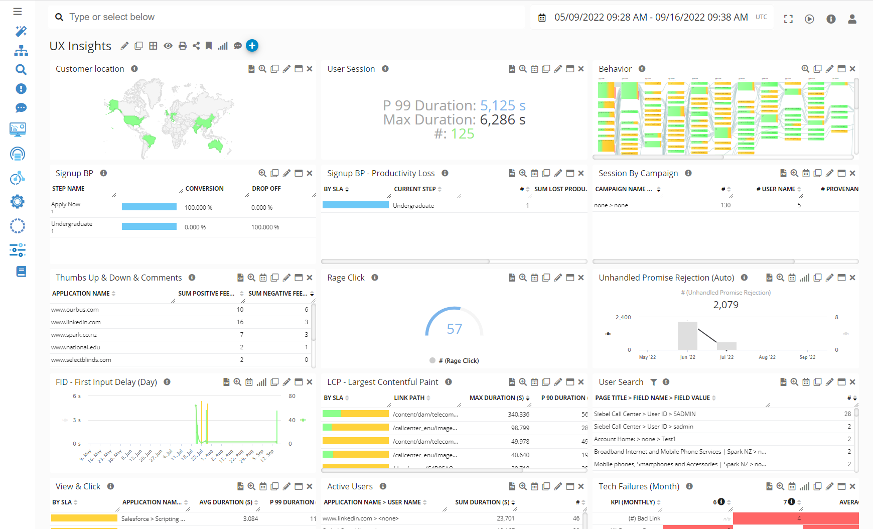 Example of an Aggregate Dashboard that reports real-time insights, at scale, and helps understand the business impact of any issues.