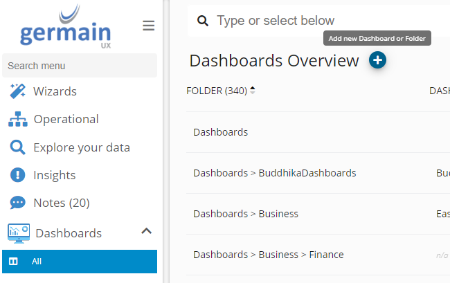 Germain Workspace > Left Menu > Dashboard > All > Click + icon