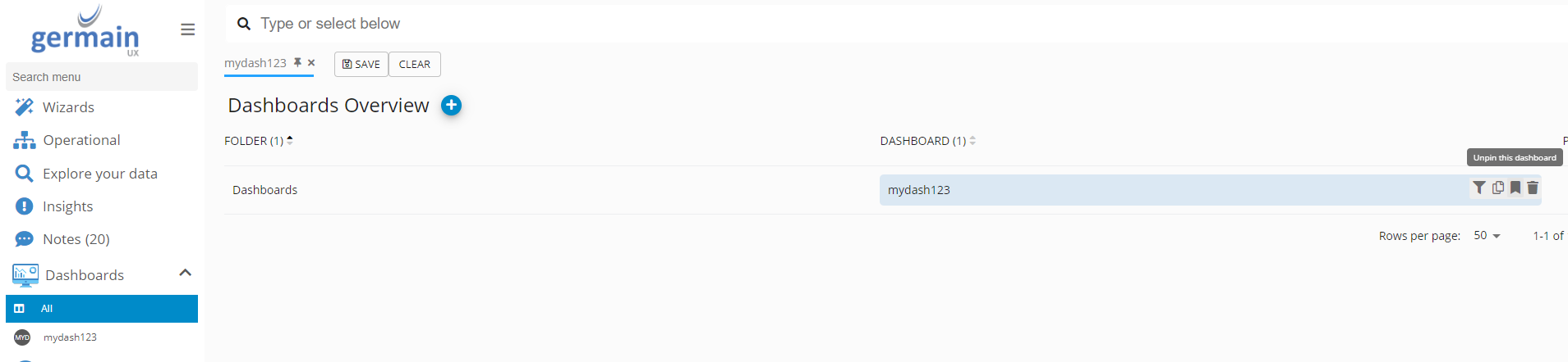 Ability to pin any Aggregate, Drill-Through or Pivot dashboards. This way, you can conveniently access them from Germain UX’s Workspace Menu.