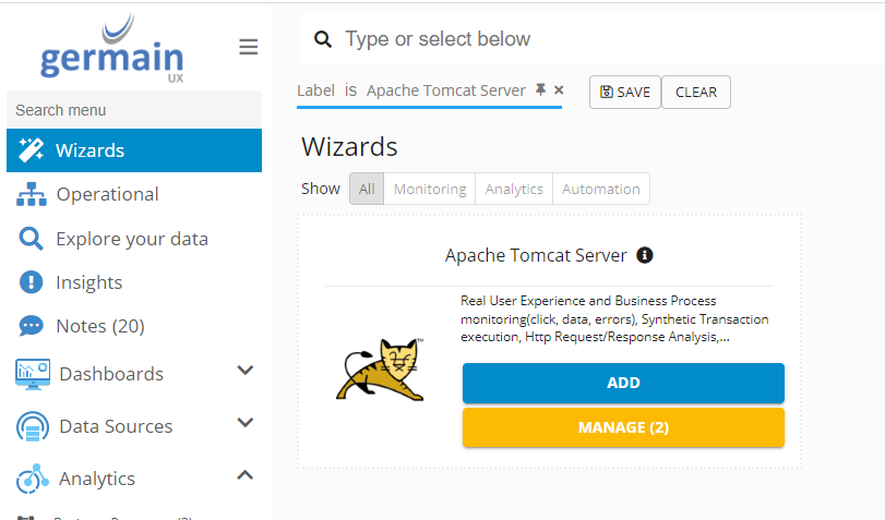 Germain provides monitoring capabilities for Apache Tomcat, allowing you to track the uptime, performance, and user experience of your Tomcat applications. Germain monitors Tomcat from various standpoints and leverages multiple data sources, such as logs, portal, and JavaScript injection, to gather insights into its performance and user experience.