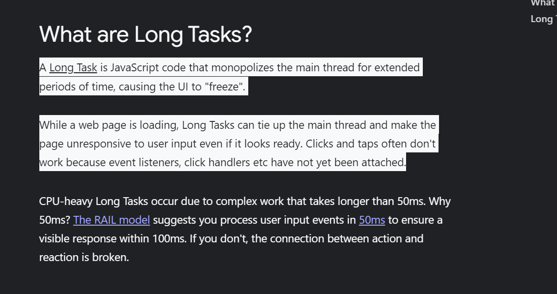 Here is what Chrome Dev team says about JavaScript Long Task: https://web.dev/long-tasks-devtools/