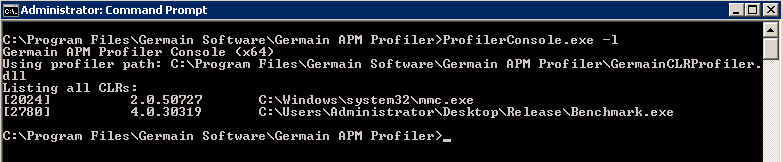 The profiler console can be used to list all currently running .NET CLRs. Please note, that the 32 and 64 bit versions of the console will only show .NET CLRs of the corresponding architecture (i.e., 64 bit console will only show 64 bit CLRs).