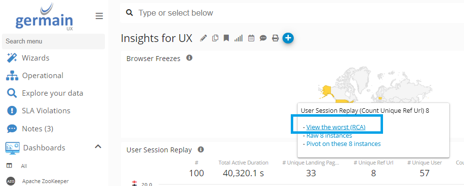 Existing RCA Dashboards are either accessible by moving your mouse over any metrics on any Aggregate Dashboard and select <View the worst (RCA)>: