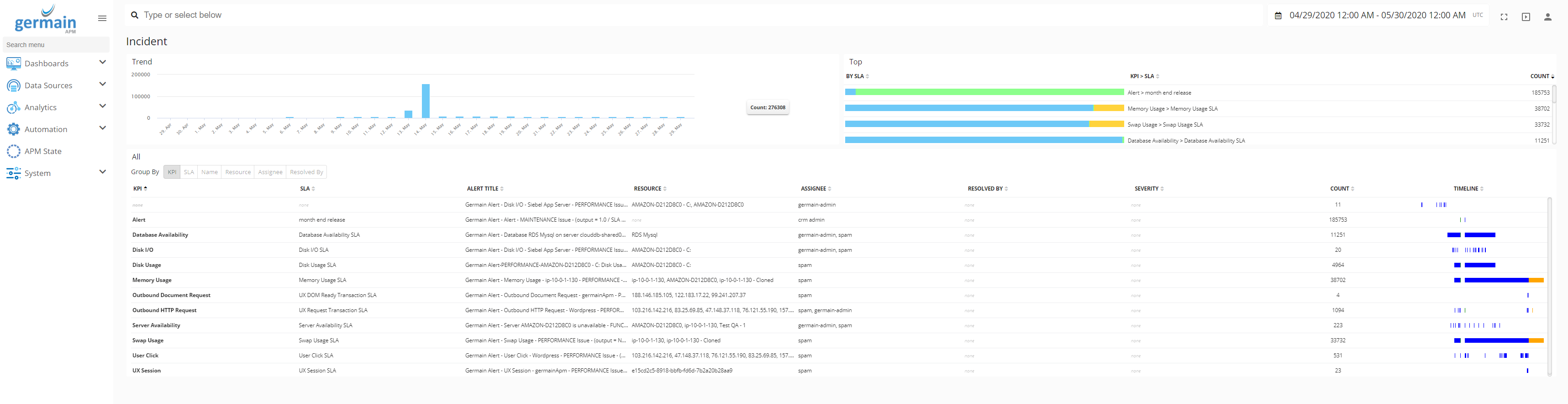Insights dashboard helps view/manage all issue(s) which Germain has alerted on. Ability to re-assign, prioritize, comment, etc.