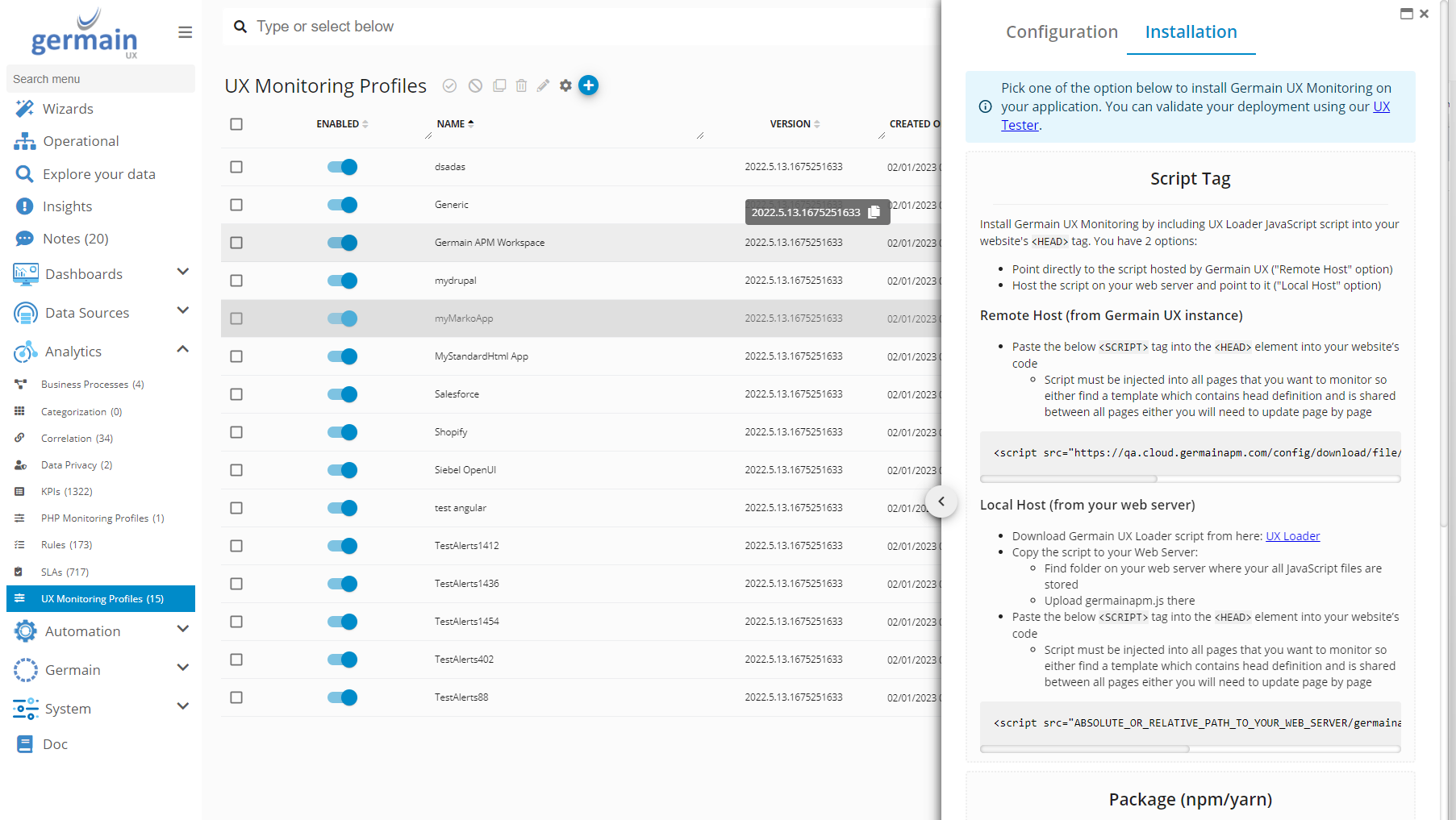 Go to Germain Workspace > Left Menu > Analytics > UX Monitoring Profiles