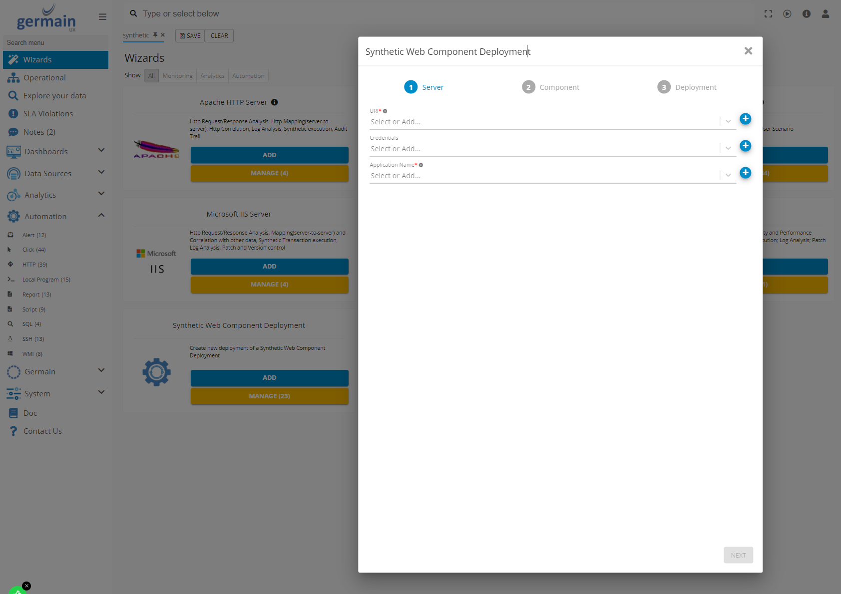 After having recorded your Synthetic Scenario, one way of deploying is to use the “Synthetic Web Component Deployment” wizard (Left Menu > Wizards > “Synthetic Web Component Deployment”)