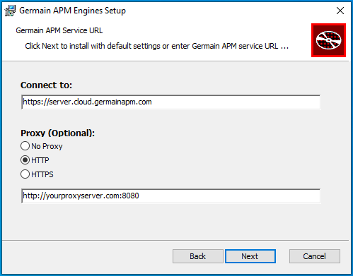 Fill in your Server address. (Optional) If there is a Proxy between your Germain Engine and Germain, fill in your Proxy info.