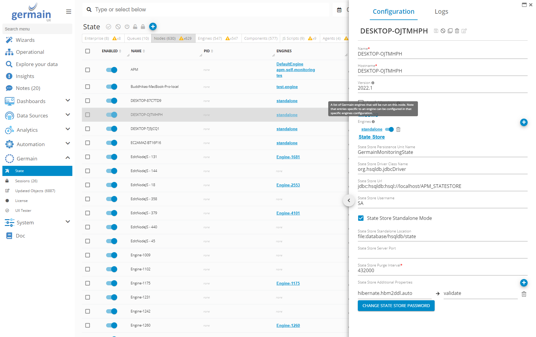 $ENGINE_HOME/config/germain-bootstrap.properties:germain.bootstrap.configService- Set to the URL of your Germain servergermain.bootstrap.configUser- Specify the Germain user you are planning to use to connect (by default, admin)germain.bootstrap.configPassword- Specify the corresponding passwordgermain.bootstrap.node- 2 options here:If you leave this value empty, the engine will automatically register a new node configuration on the Germain server (preferred)