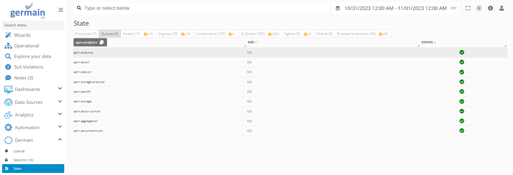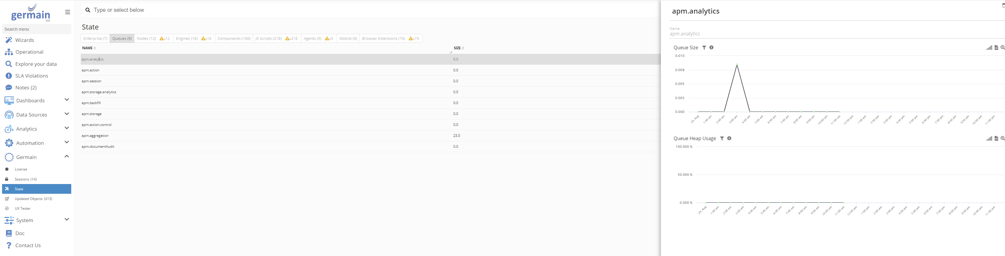 Use Queues tab on Germain State dashboard to manage Germain Queues. Ensure the queues are all near 0 or assess the pace at which they are being processed to control how real-time the automated analytics and transactions are going to be processed by Germain UX.