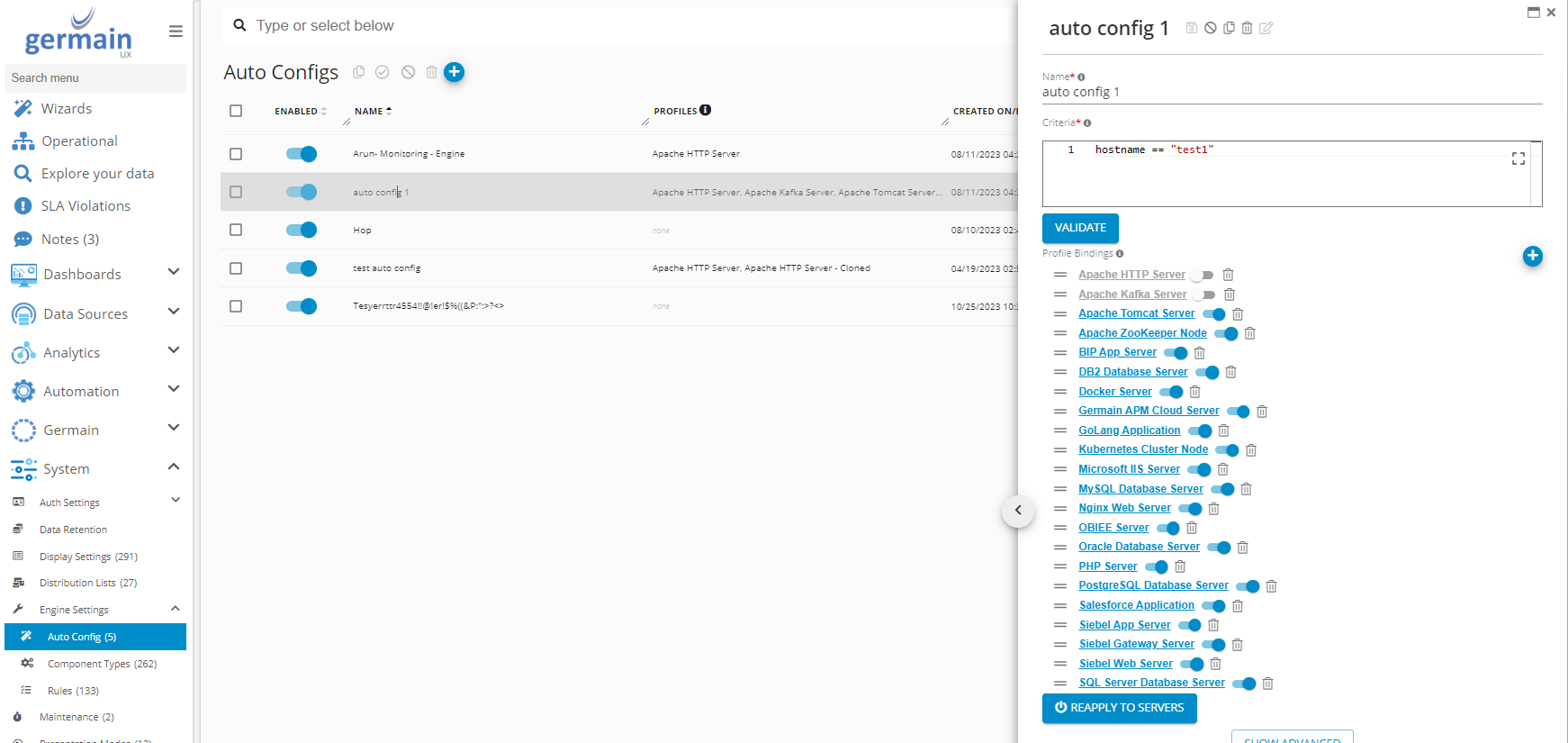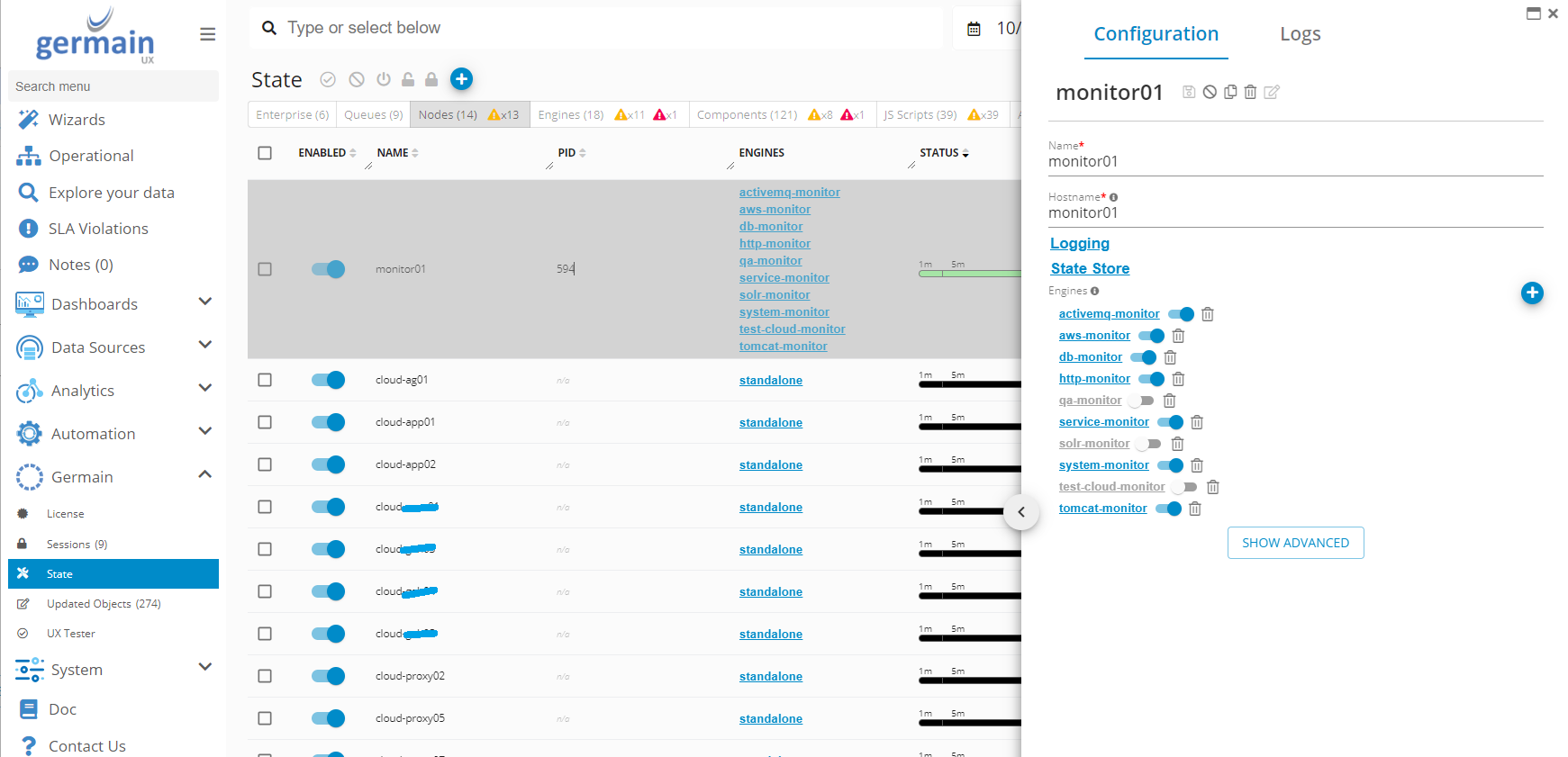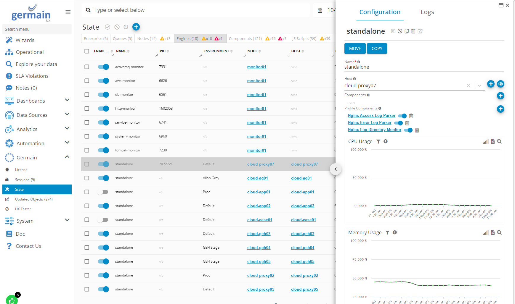 Use Engines tab on Germain State dashboard to manage Germain Engines instances.