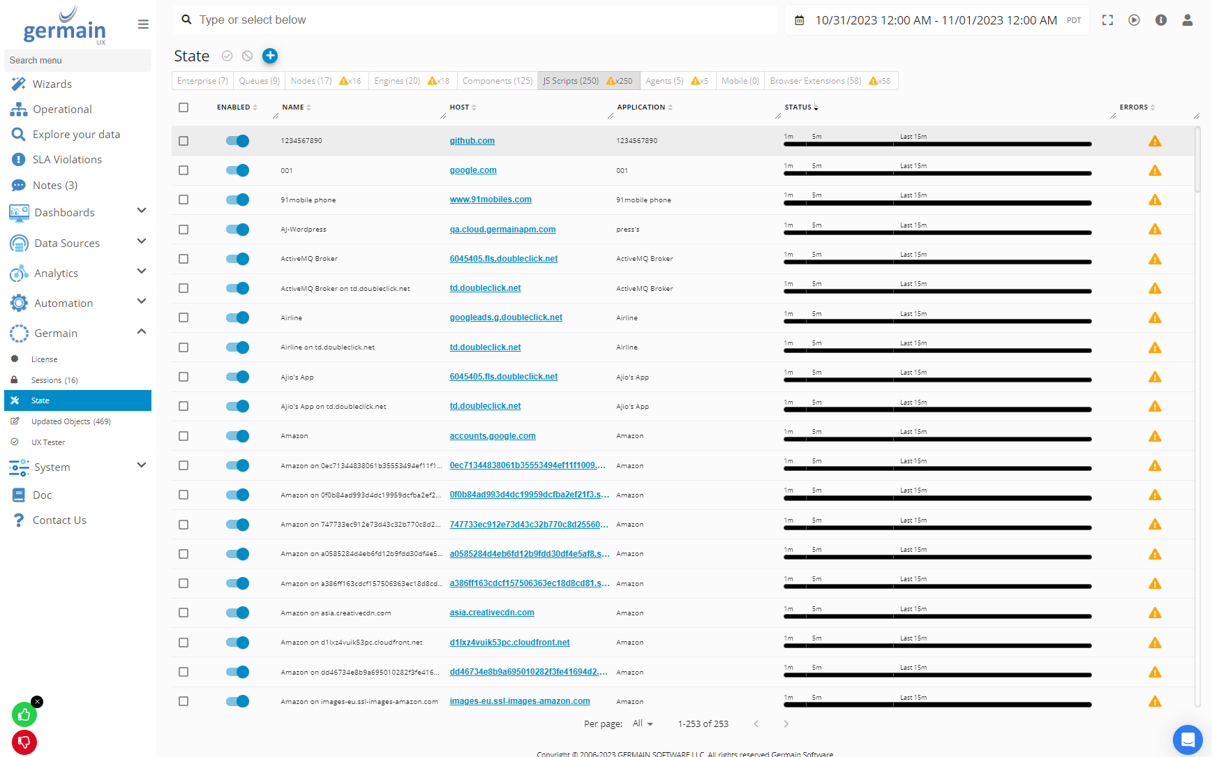 Use JS Scripts tab on Germain State dashboard to manage Germain RUM JS or Germain JS Profiler.