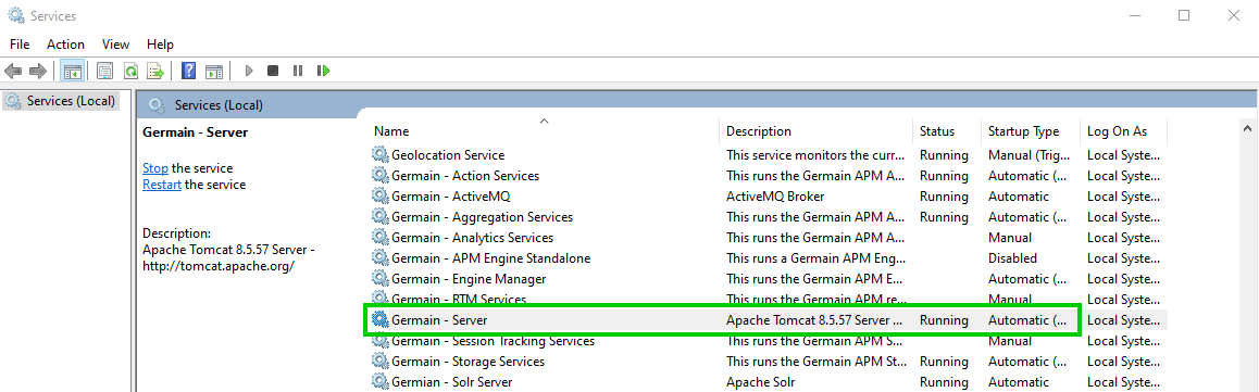 On Windows, the Germain Enterprise Server is registered as a system service. To start or stop the service, use the Services Console:
