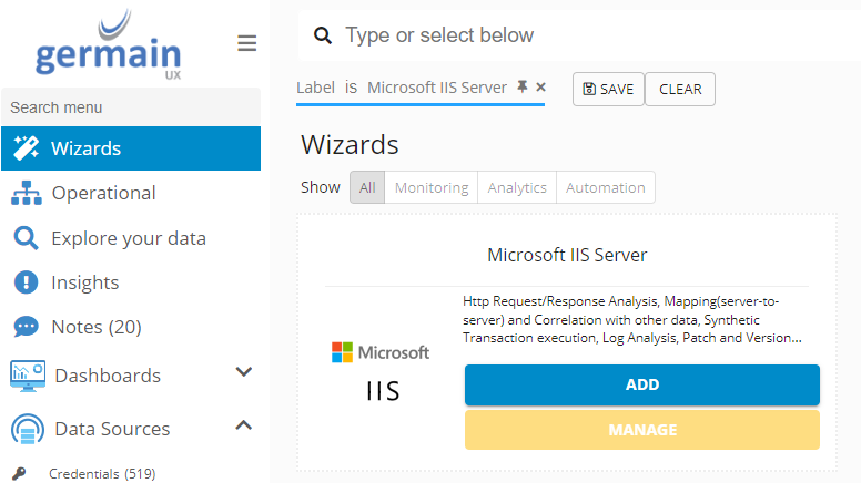 Go to Germain Workspace > Left Menu > Wizards > Microsoft IIS Server