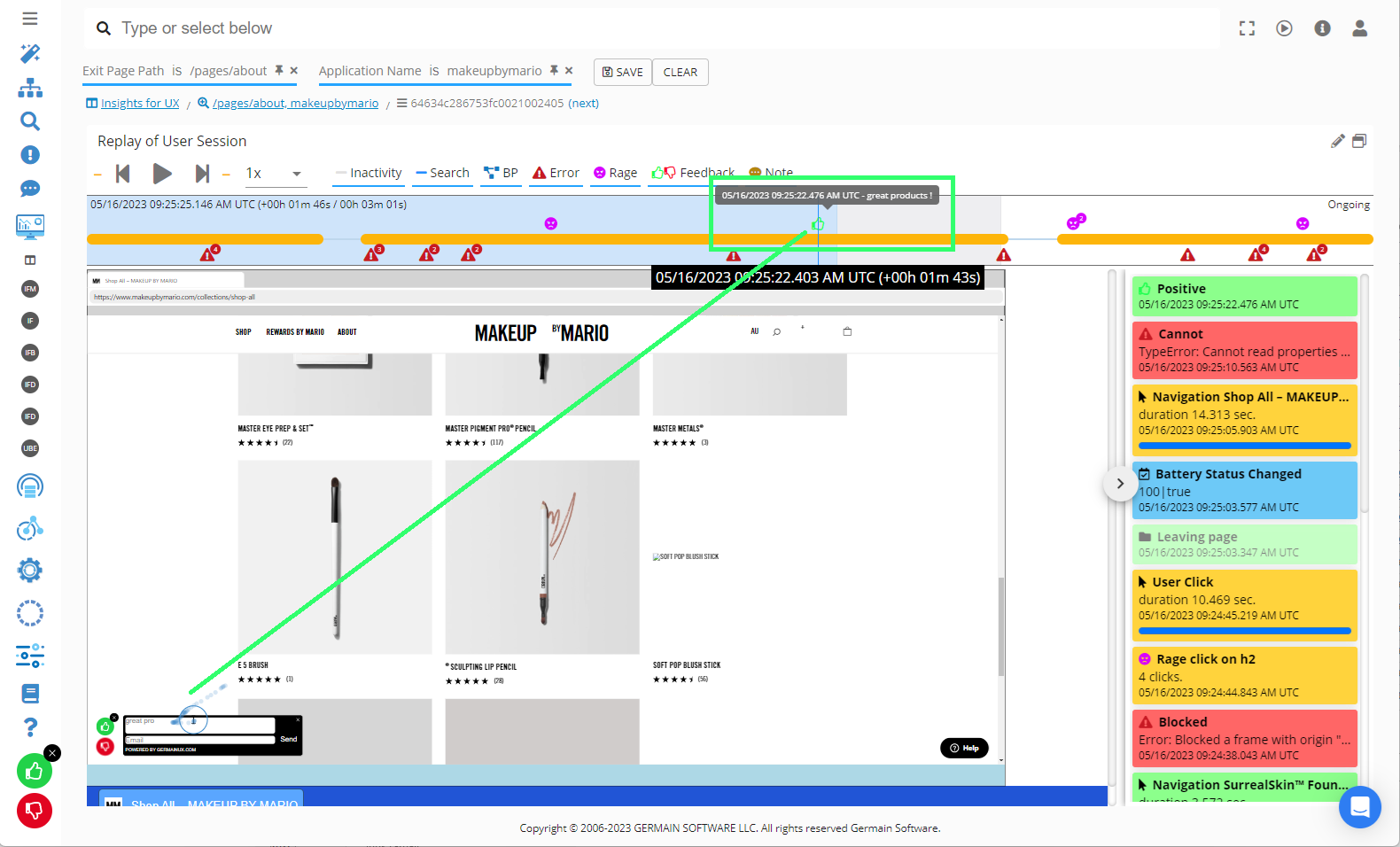 Magento visitors can provide their quick feedback via Germain UX’s Feedback Popup. That feedback is then available at scale on various Germain Dashboards, and it can be replayed on the Session Replay Dashboard, so it is easy to understand consumers feedback and why potentially they complain.