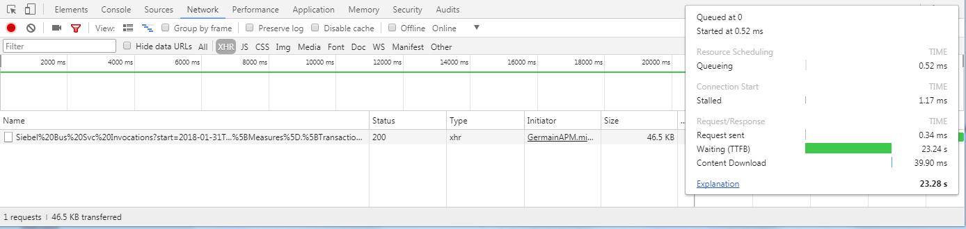 Click on "Drill-through" (of Germain dashboard) on "Siebel Svc Txns" portlet, takes 23.28 seconds
