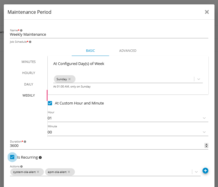 Recurring | recurring | If false, the maintenance period will apply once | Boolean | |