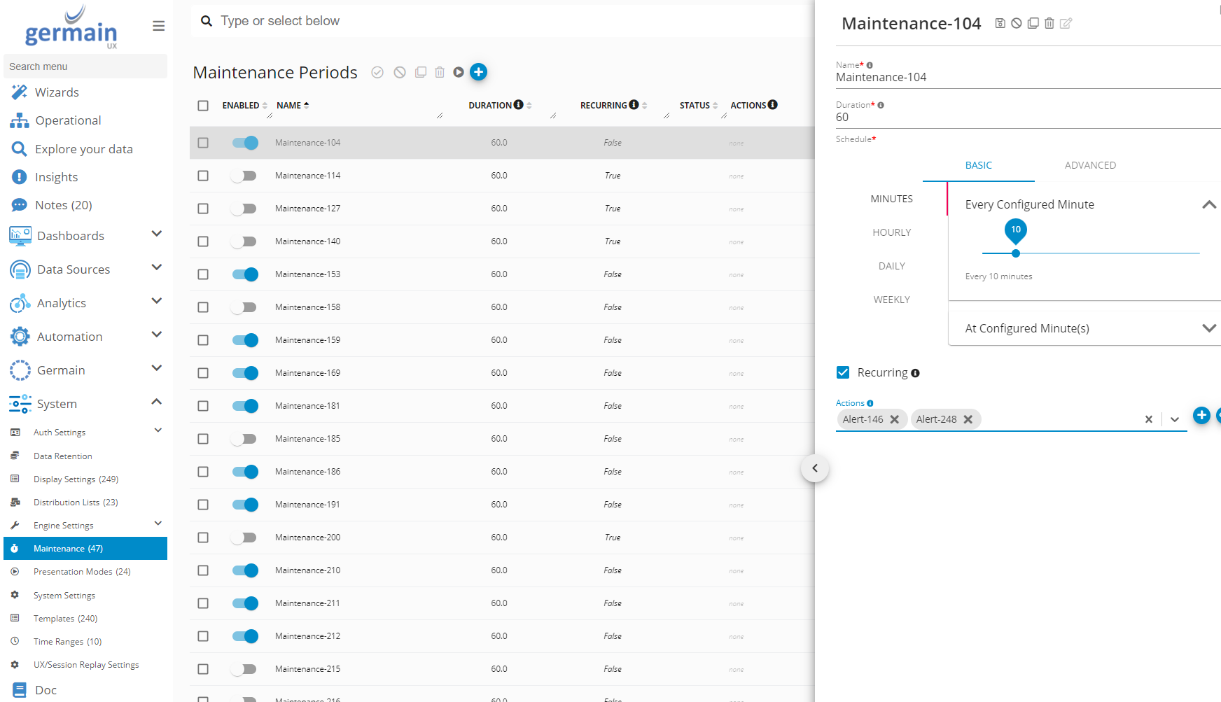 Recurring or one-time Maintenance Periods can be configured via the Maintenance view under System folder