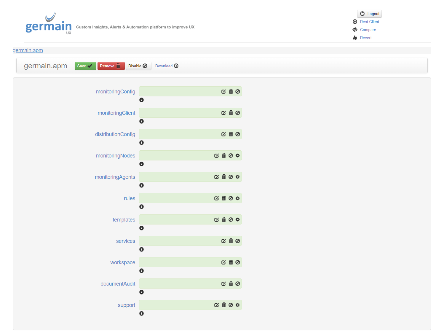 Together, Workspace and the config console provide a comprehensive and flexible user interface for managing and configuring your Germain environment, ensuring that you have the necessary tools and options to effectively monitor and optimize your applications.