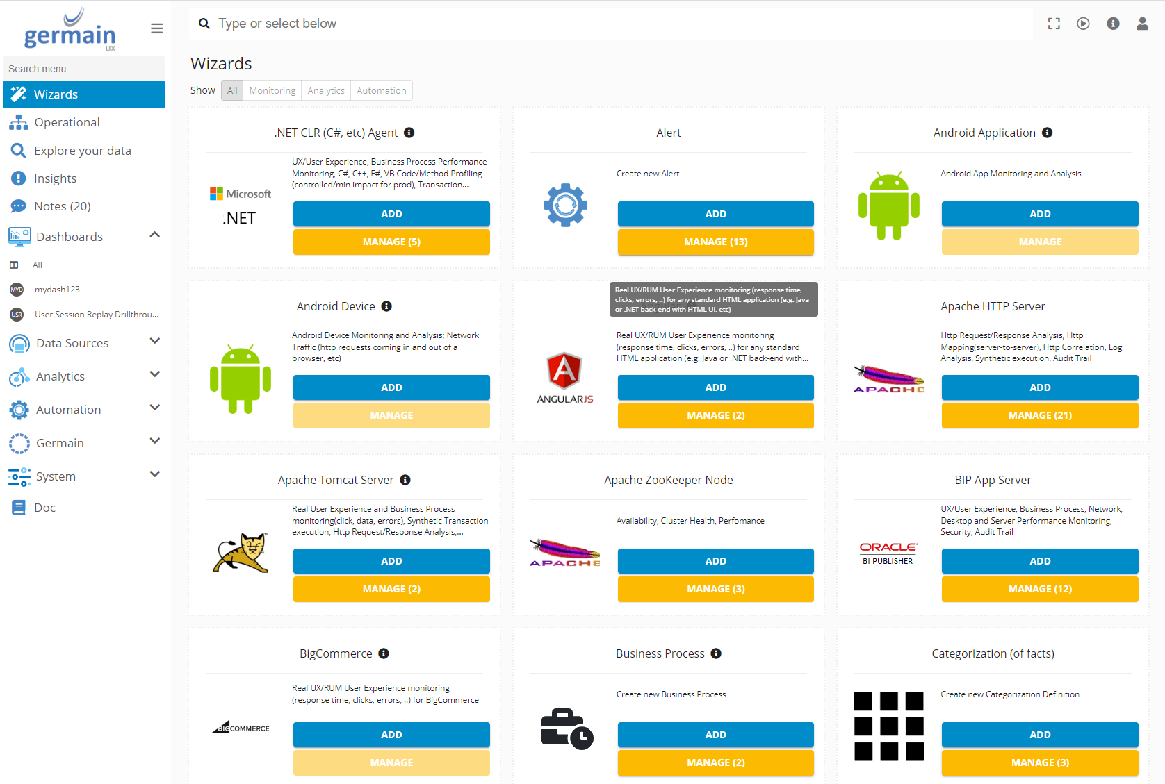 Default place to go to configure anything. Within Germain Workspace, you can access different modules and tools, such as monitoring dashboards, configuration wizards, performance analysis, user experience insights, and more. It offers a comprehensive set of features to monitor and manage your applications effectively.