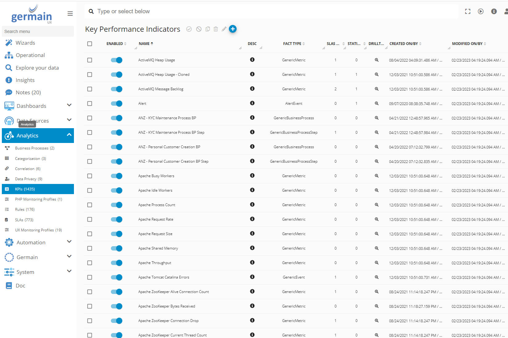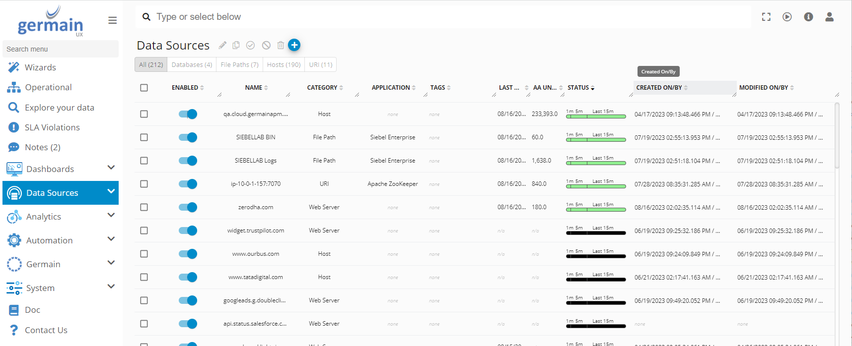 The Data Source dashboard allows you to effectively manage all the data sources from which Germain UX collects data or executes transactions. A Data Source can encompass any software or hardware resource. Furthermore, the customization of Data Source categories, among other entities, is available to better align with various environments.