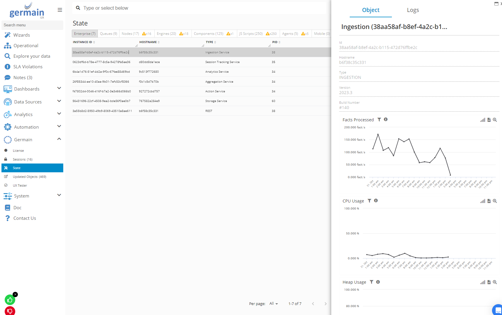 The Germain State Dashboard is where you can monitor the health of Germain, including the Engine, Enterprise, Nodes, Queues, and more. More details on how manage Germain health.