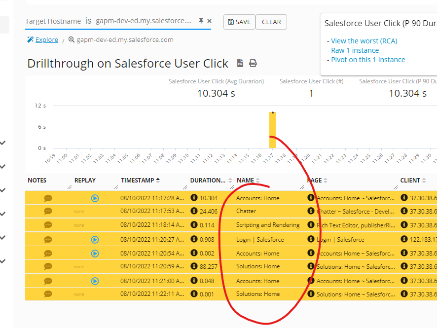 Time breakdown of a User Click, from the browser to the backend application and database of Salesforce.com.