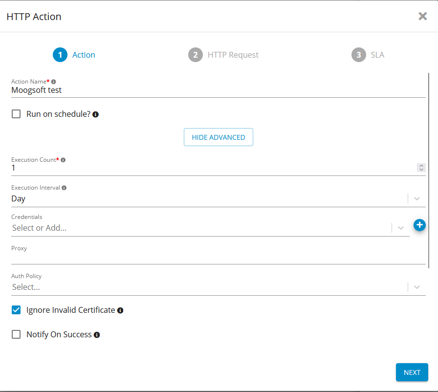 Type in the action name, “Test Moogsoft”, Execution count as 1 and click Next.