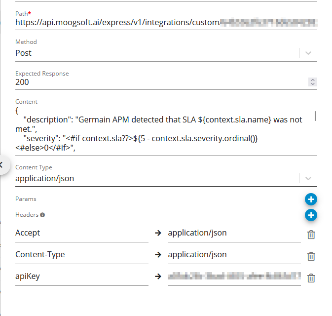 Germain integrates with Moogsoft using Germain’s HTTP actions. In this use case, the Moogsoft API allows you to post your critical alerts (triggered by configurable SLAs or by Schedule) and send data to Moogsoft in real time.