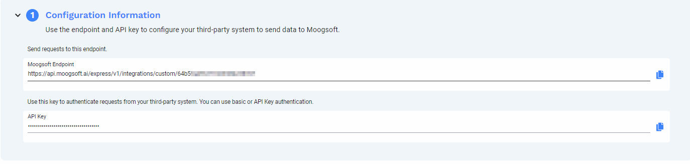 After completing the setup, you should have the Moogsoft endpoint and the API Key.