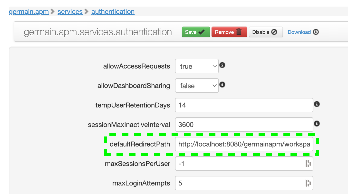 Navigate to monitoringConfig > systemConfig > authentication. In AuthenticationConfig, set the following: