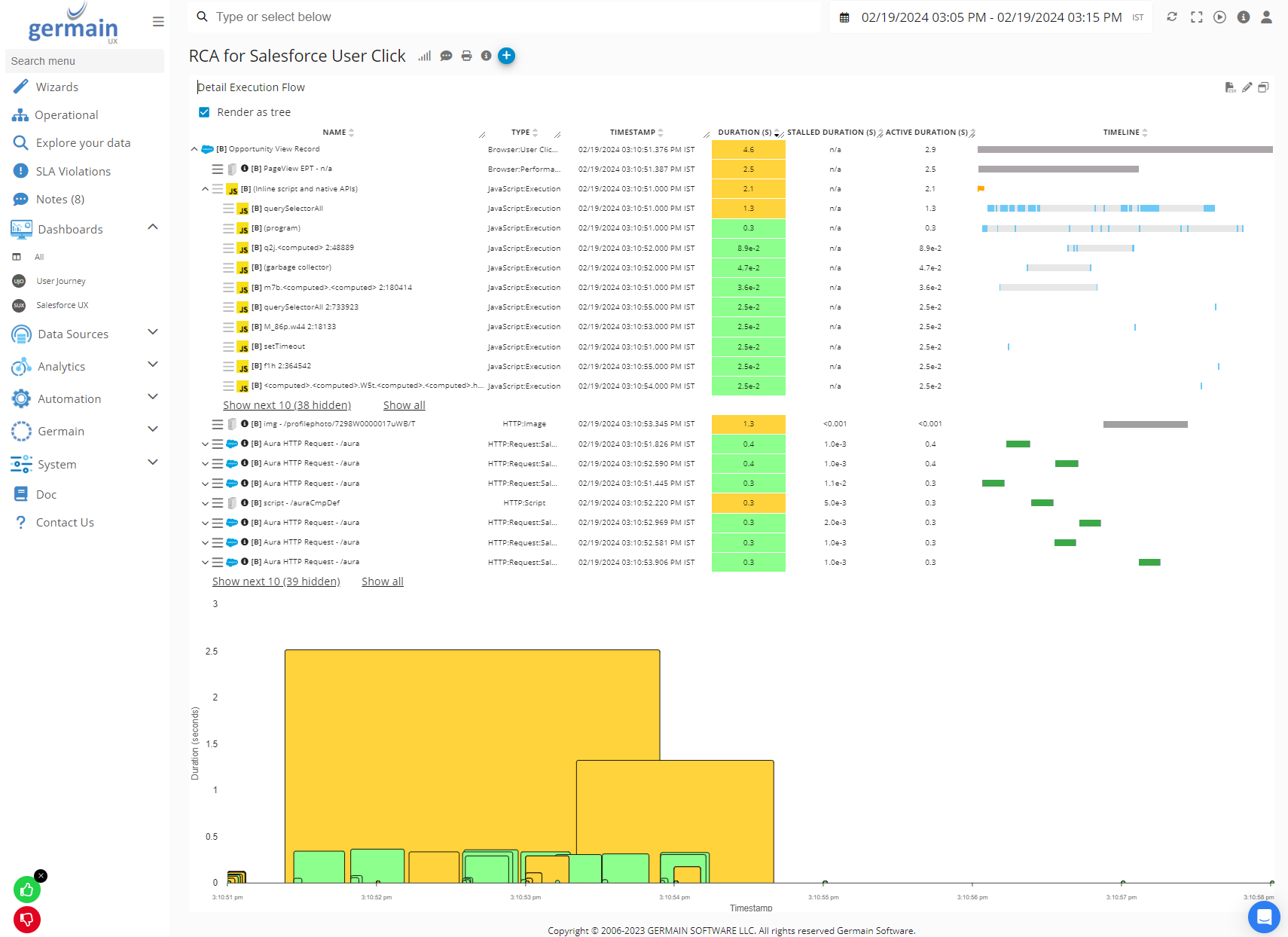 Germain provides end-to-end transaction tracing, capturing data flow from JavaScript to HTTP requests, integrations, Apex code, database operations, and more in real-time, 24/7. With Germain's comprehensive monitoring, organizations using Salesforce Classic and Lightning can gain insights, automate issue detection, and optimize the performance and user experience of their Salesforce Cloud applications.