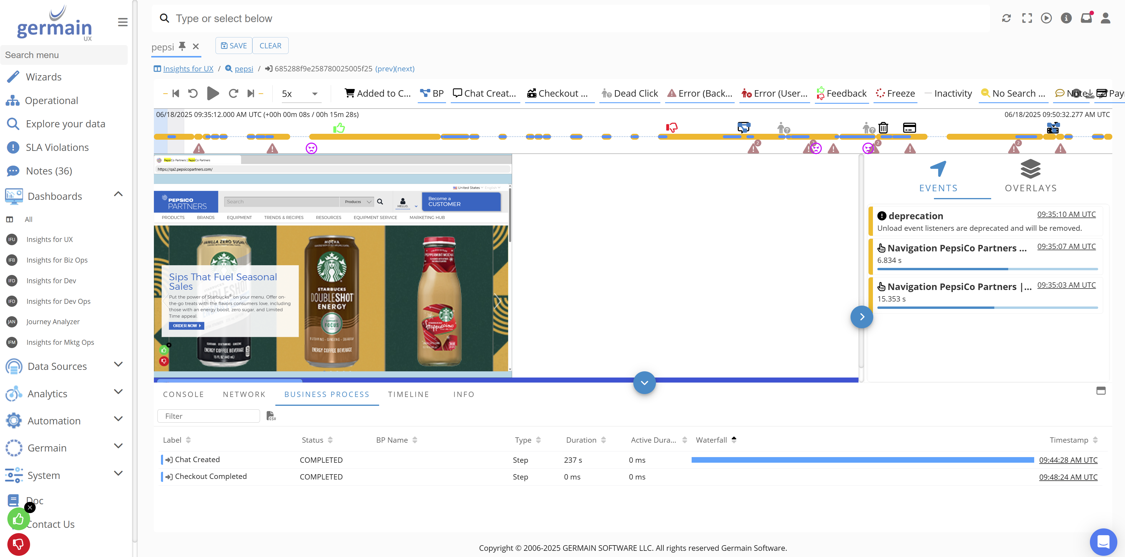 Germain automatically records millisecond-precise, pixel-perfect user sessions 24/7, providing real-time insights to understand both the 'what' and the 'why.' Germain UX identifies friction points and their underlying causes, streamlining business impact analysis for critical UX, Adoption, and Productivity issues without the need to review numerous videos. You can quickly replay specific segments of recorded sessions by searching for your priorities. All business or metadata data is fully searchable, maintaining GDPR compliance, whether at scale or within a recorded session.