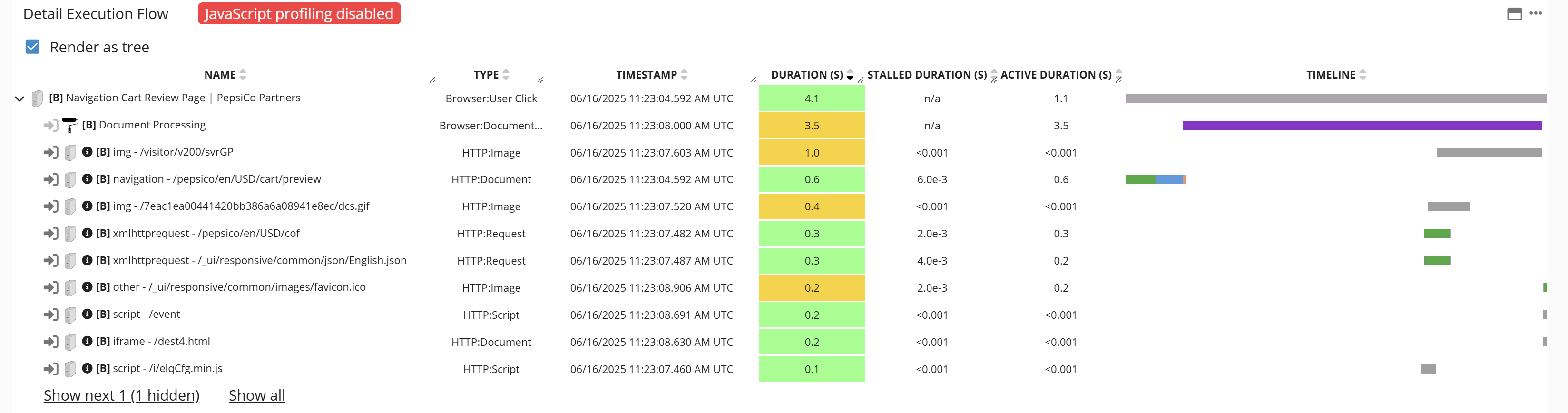 Advanced time analysis, that includes line-by-line analysis of browser javascript/eScript execution time (when Germain UX - RUM JS and Germain UX - RUM Extension are both enabled)