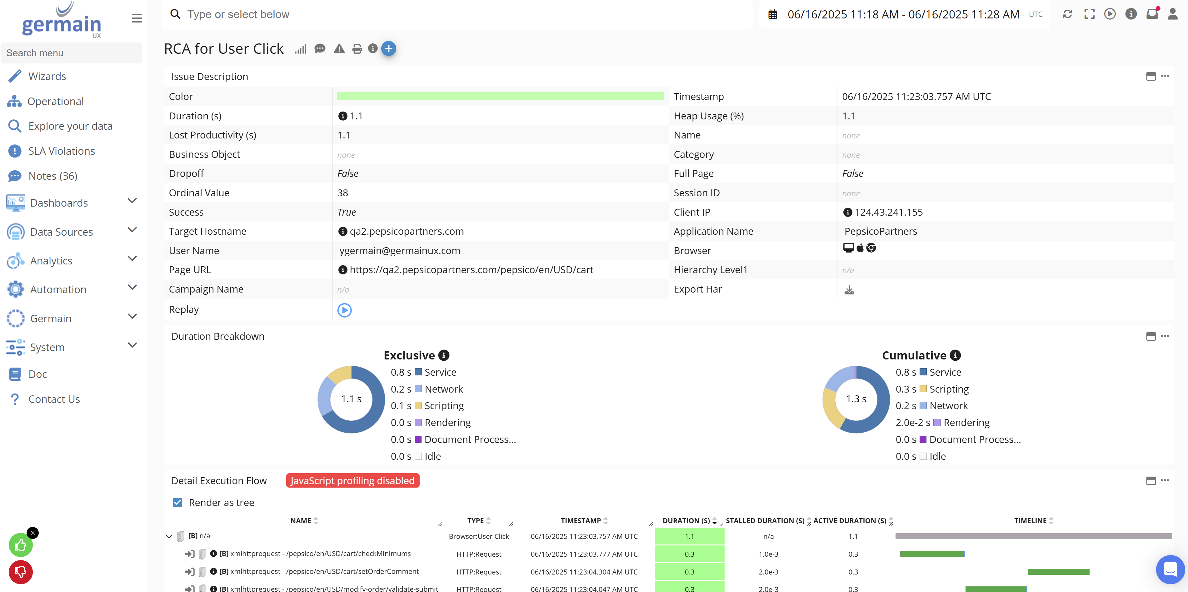 Advanced time analysis, that includes line-by-line analysis of browser javascript/eScript execution time (when Germain UX - RUM JS and Germain UX - RUM Extension are enabled)