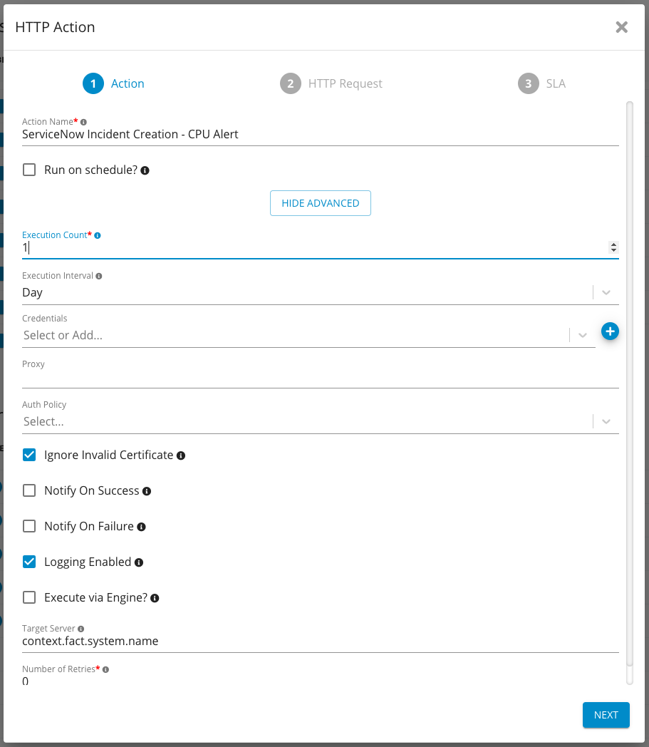 Type in the action name, “ServiceNow Incident Creation - CPU Alert”, Execution count as 1 and click Next.